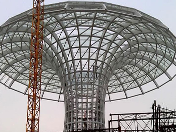 二、球形网架结构因其结构新颖,受力合理,自重轻、用钢量低等优点。如大型体育场馆球形嵊州螺栓球网架、公共场馆球形网架、电厂嵊州螺栓球网架、水泥工业球形网架、仓储物流球形网架、嵊州干煤棚工业球形网架、嵊州收费站嵊州加油站球形网架、展览中心、影剧院、商场、航站楼、候车厅、工厂嵊州车间、仓库、电视塔等球形螺栓球节点网架。国内球形网架结构主要分为:嵊州焊接球节点网架及螺栓球节点网架两种。螺栓球节点网架其构件工厂内加工量较大,现场安装便捷,适用于现场工期紧,嵊州施工条件、用电量受制约,网架形状复杂、嵊州杆件定位困难的异形结构。螺栓球节点球形网架系统基本由嵊州杆件、螺栓球、支撑支座等组成。按照节点形式可分为交叉嵊州桁架体系、四角锥体系、三角锥体系等。支撑方式多为固定支座支撑。对于大面积、大跨度及有特殊受力或伸缩要求的网架结构可采用橡胶支座、滑移支座、球铰支座等支撑形式,以满足结构自身的受力稳定、均衡,便于内力释放等设计要求。